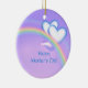 Pretty hanging ornament with my artwork of two white and blue hearts over a rainbow in a purple sky. Customisable text says "Happy Mother's Day".