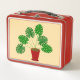 This awesome lunchbox features a digital art image of a series of leaves from a houseplant called a Monstera, also known as the Swiss Cheese Plant. The leaves are dark green and lobed and some have holes in them. The plant pot is red and contains some brown soil.