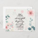 Inspirational Mother's Day postcard depicts a beautiful floral design with pink and blue flowers and greenery. It features Bible Verse Proverbs 31:25, "She is clothed with strength and dignity and she laughs without fear of the future." The greeting can be customized and the card used for many occasions.
