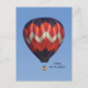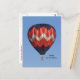 This hot air balloon is named Mothra. Its bright red, orange, purple and white zig-zags are displayed on a sky blue background along with its name on this postcard.