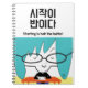 A large cartoon illustration of a woman writing in a notebook. A motivating Korean expression in hangul to encourage journaling and handwriting.