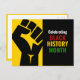 Motivational BLACK HISTORY MONTH postcard showing black raised fist graphic against a rich yellow background on the left, and CELEBRATING BLACK HISTORY MONTH in bold white, red, yellow, green typography set against a rich black background on the right. On the reverse there is a CUSTOMIZABLE greeting which you can personalise with your own wording. A great way to keep in touch over the Black History Month season. Other varieties of BHM cards, invitations, clothing and decor are available.