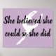 She believed she could so she did is written in pretty black brush-stroke script on a pale purple background. A white silhouette of a dancer doing a leap is seen in the background. Don't like the purple background? You can pick your own colour by clicking on the customise link.