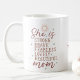 This simple design features the phrase, "She is strong, brave, fearless, lovely, beautiful, Mum." with cute star and sun accents. This coffee mug can be personalised with a name or initials. A great gift for that special woman in your life for any occasion!