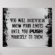 Motivational Quote Posters and Prints. You will never know your limits until you push yourself to them with silver faux metallic background and grunge edges. Great for any area of your life. Fitness, workouts, running, work, self image, sports and daily living.