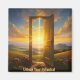 A radiant key glowing in vibrant golden hues, unlocking a door to a sunlit horizon with lush green fields and a clear sky.