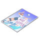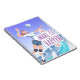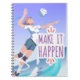 This notebook cover design features an illustrated, cartoon-style female volleyball player in mid-action, performing a jump serve. The dynamic composition highlights movement and energy, with swirling motion lines and a gradient background transitioning from soft blue to purple. The volleyball and athlete's pose emphasize themes of sports, health, and dedication. A motivational phrase, "MAKE IT HAPPEN," is prominently displayed in bold purple text, surrounded by decorative elements in red and white.