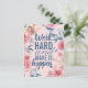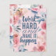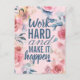 Motivational inspirational words: Work Hard and Make It Happen. Motivational words of wisdom. If you work hard, no matter how big your dreams are (dare to dream big), you'll get your dreams come true, that's the formula of success. These words are on a lovely blush pink artistic Postcard featuring an original floral watercolor pink roses wreath.