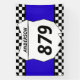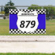 Tailgate in style at your next motocross race with personalised banner. This banner has a white number plate that's ready to be personalised with your name and bike number. The number plate is set against a bright blue background with a black and white chequered flag border.