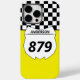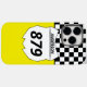 This custom motocross themed phone case has a white number plate graphic that's ready to be personalised with your name and bike number. The number plate is set against a yellow background with a black and white chequered flag border.