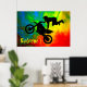 The sports action and energy of motocross athletes are captured in silhouettes of action figures demonstrating extreme tricks and stunts on their motorcycles. Digital paintings and illustrations of these teens and young men include backgrounds of bright, vivid colours and splashes and bursts of light to highlight the action. They also show off in grungy and edgy off road scenes where competitors earn their street creds showing off their motocross skills.