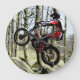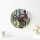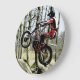 A poster effect design of a motorcycle trials bike and rider in mid air, in red white and black, with a green and blue background of trees and rocks. The clock face has black and white numbers and dots.