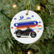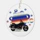 Motorcycle Customizable Christmas Ornament by Heard_ & 369, features a retro American motorcycle design on the ornament front and a fully customizable back. Date can be added, too. Shown are the editable words, Merry Christmas.