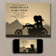 This wedding invitation features a silhouette couple riding a motorcycle with a mountain background.