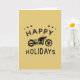Motorcycle Christmas card with a retro design features a motorcycle silhouette with the words Happy Holidays in vintage fonts with stars above, all in black on a pale gold background. Inside text "Enjoy the Ride" can be edited if you like. Old style holiday wishes for biker friends.