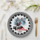 Kids who love racing and motorcycles will love this 4th birthday motorcycle racing theme paper plate design featuring a red motorcycle with driver, chequered flags, text that reads It's My 4th Birthday, and a border with a black decorative ring and black and white checks. You can easily personalise these racing theme fourth birthday paper plates with a name before ordering.