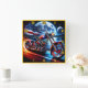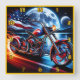 A striking motorcycle speeds along a riverside, illuminated by a bright moon and vibrant colours of the American flag waving behind it.