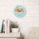 Add a custom touch to your RV decor with this round wall clock that has a painted look. A sunny orange motorhome with blue trim rides along the road in front of a blue sky, heart-shaped balloons flying in the breeze. Instead of "home sweet home," the text says "roam sweet roam."