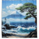 A serene painting of Mount Fuji with an ocean view, framed by elegant bonsai trees, capturing the tranquil beauty of traditional Japanese landscapes.