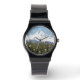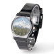 Stylish, men's wrist watch with white numerals that features a scenic photo image of snow capped Mount Hood towering above fruit orchards in the valley. Select your watch from several styles.