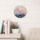 Decorate a living space with this stylish wall clock with white numerals and features the scenic photo image of a glowing, pink alpenglow on Mount Rainier watching over the city of Tacoma, Washington. Select your clock style and size along with hand colour. Use to decorate a living room, dining room, kitchen, bedroom, or any other room.