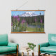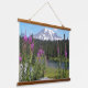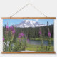 Decorate your living space with this horizontal, hanging wall tapestry with wooden tops that features a scenic photo image of snow capped Mount Rainier and pink Fireweed wildflowers growing along a mountain lake.
