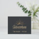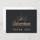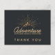 A thank you postcard with a gold coloured illustration on a black-grey background. Designed with an illustration of a mountain with the suns rays shining outward from behind. Typography says: Adventure explore dream discover.