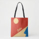 Edge of Mountain Illustration Mountain and Sun Mid Century Geometric Art Tote Bag is really colourful art with red vivid colour.