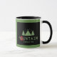 Mountains, trees, stars, tent and a little red lantern... what else do you need when it comes to mountain camping? Modern silhouette style design on green background