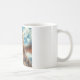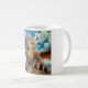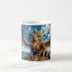 A fierce dragon with bright blue eyes and sharp claws spreads its wings wide against a backdrop of a clear, cloud-filled sky. Its scales are intricately detailed, and it stands poised atop a rocky mountain landscape.