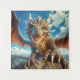 A fierce dragon with bright blue eyes and sharp claws spreads its wings wide against a backdrop of a clear, cloud-filled sky. Its scales are intricately detailed, and it stands poised atop a rocky mountain landscape.