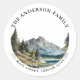 Return address label featuring a watercolor landscape with mountain & forest of pine trees.