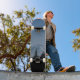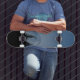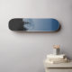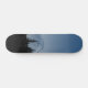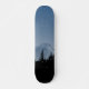 A modern image of a mountain and forest with a blue gradient is featured on this unique skateboard deck.