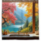 This shower curtain has a beautiful mountain view from a kitchen pictured on it.