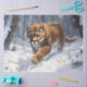 A striking portrayal of a mountain lion prowling gracefully through a snowy landscape. The sleek predator is depicted with intense focus, surrounded by the quiet beauty of a winter wilderness. This artwork captures the power and elegance of the mountain lion in its natural habitat.