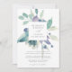 Our Mountain Meadow wedding invitation frames your names with an oversized square border of spring pastel foliage and flowers in sheer watercolor shades of mint green, sage, lavender, and violet purple. Personalise with your wedding details beneath in classic grey lettering. A modern and elegant take on the botanical trend for spring and summer weddings.