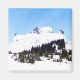 A painting of a snow covered mountain top that is the body for three young mountain goats. This winter mountainous scene features small groupings of pine trees, and a lovely blue sky.
