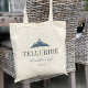 Welcome guests to your wintry destination wedding with these chic and modern personalised tote bags. Design features an illustration of snowy mountain peaks in blue with your wedding destination beneath (shown with Telluride, Colorado) in classic serif lettering. Add your names beneath in handwritten cursive script, as well as the year. Colours can be changed to match your wedding colours using Zazzle's design tool.