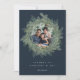 Elegant and understated holiday photo card features a rich navy blue background with a lush botanical wreath of pine foliage surrounding your favourite photo. Personalise with a custom greeting and your names beneath (shown with "tidings of comfort and joy'). Add two additional photos and a custom personal message to the back to complete this lovely Christmas design.