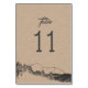 Rustic wedding table card for beautiful wedding in natural surroundings with kraft paper background and decorative font w mountain and forest illustration on the bottom