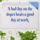 This is funny and inspirational for the skier in your life. The mountain with white snow and blue sky and writing saying: A bad day on the slopes beats a good day at work.