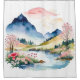 Watercolor scene of mountains and a river surrounded by trees and flowers of summer. Beautiful colours of blue and peach.
