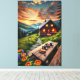 Bring the calming beauty of nature into your space with this Mountain Sunset Cabin Serenity canvas print. This stunning artwork features a cosy wooden cabin glowing under a vibrant sunset, surrounded by lush green mountains, colourful wildflowers, and a rustic table with steaming cups of tea.