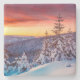 Stone coaster shown with a photo print of a beautiful sunset mountain winter scene.