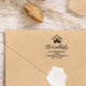 Rustic return address rubber stamp with charming fonts and the illustration of pine trees against a mountain backdrop.