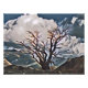 A dark dramatic abstract Welsh mountain tree design depicting mountains and harsh weather.