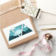 A mountain landscape with a sun and birds within three triangles in shades of blue, turquoise, and cyan.