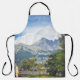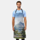 Majestic summer landscape: mountain peaks, blue sky and wooden cottages among trees. Great gift for nature, tourism, and hiking lovers.