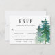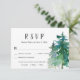 Mountain Wedding RSVP Card with dinner choice and number attending option. The card is decorated with tall pine trees on the right of the card. The back of the card includes a beautiful watercolor mountain scene with water and a pine forest in the foreground. This rustic mountain reply card matches a collection in my store.