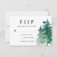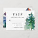Mountain Wedding RSVP Card with number attending option. The card is decorated with tall pine trees on the right of the card. The back of the card includes a beautiful watercolor mountain scene with water and a pine forest in the foreground. This rustic mountain reply card matches a collection in my store.
